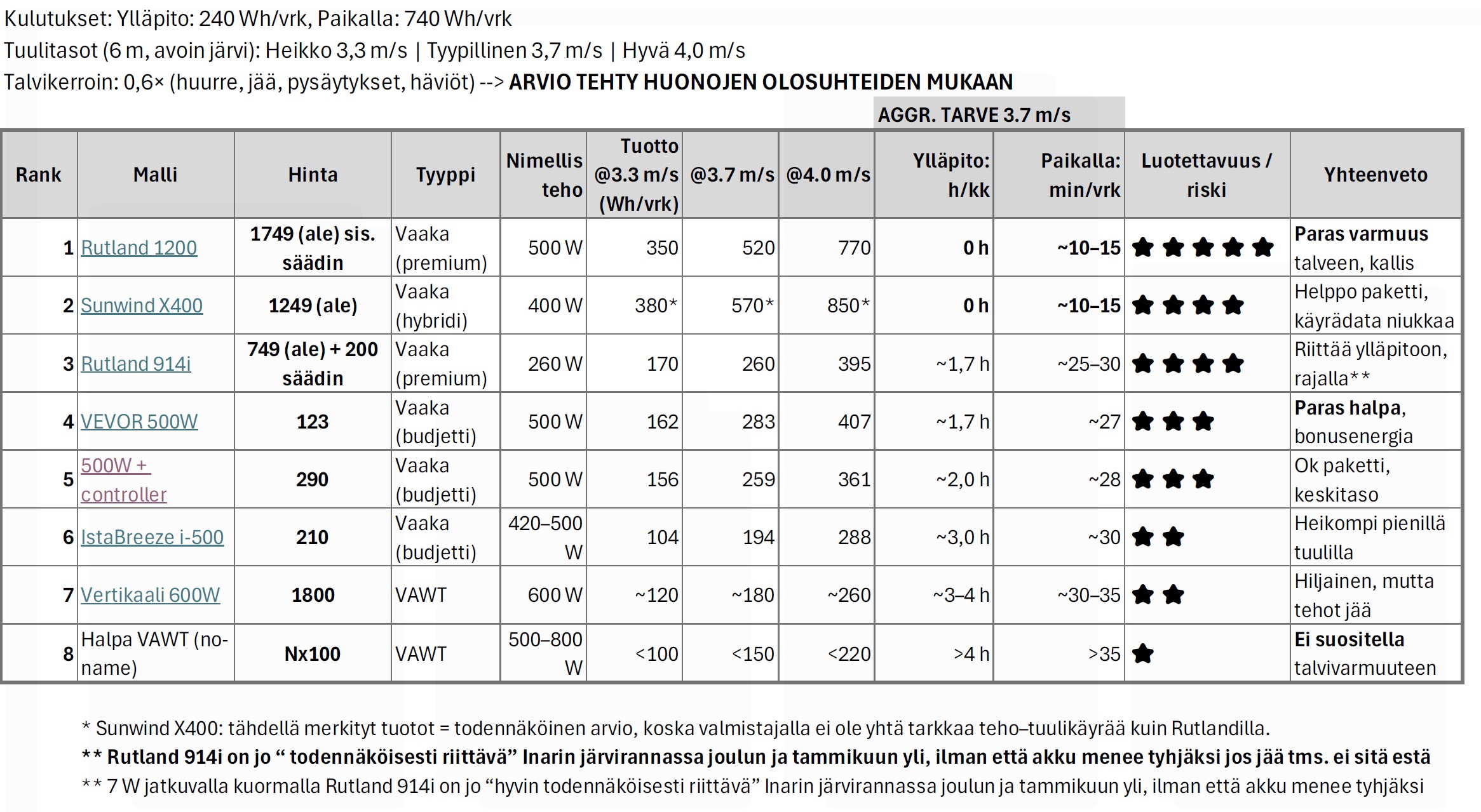• Tuulimylly 200–500 W (tai max ~1 kW, jos paikka on selvästi tosi tuulinen ja masto kunnollinen)